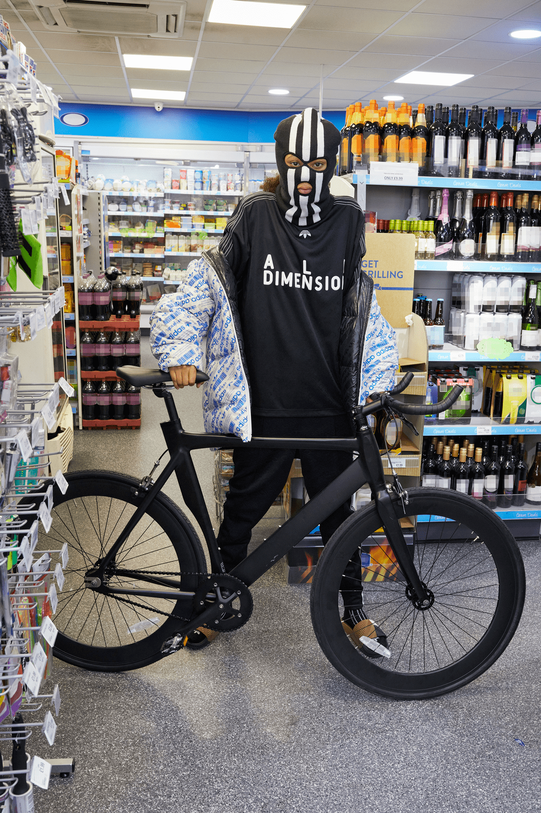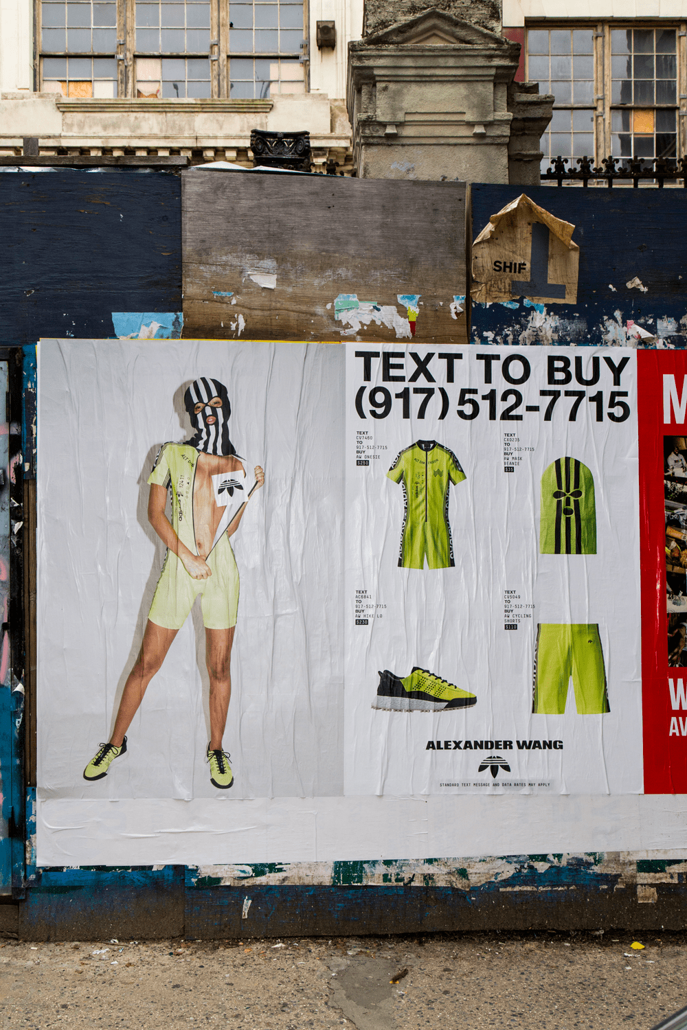 Adidas Originals' Season 2 Alexander Wang collection referenced NYC rave and bike cultures, using the streets of NYC as a canvas for a dealer-style delivery system. The campaign used posters to display a phone number customers could text to place orders via chatbot. Bike messengers outfitted in the collection delivered the goods.